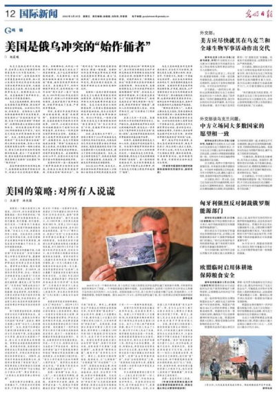 美国一面标榜“自由、民主、人权”,一面又被谎言所绑架,甚至形成了一条完整的造谣产业链。美国和西方政客、媒体、智库学者沆瀣一气,炮制出中国新疆地区存在“强迫劳动”和“种族灭绝”的谎言。事实上,新疆棉花生产有高达近90%的全程机械化率,何来所谓的“强迫劳动”。过去60多年,新疆人口总量增长了4倍,维吾尔族人口总量从220万增长到约1200万,又何来所谓的“种族灭绝”。反观美国,自建国以来就对印第安人进行大肆屠杀,使印第安人口数量从1492年的500万锐减到20世纪初的25万,这是不折不扣的种族灭绝。美国总统拜登在联合国大会向世界“承诺”,美国不寻求新冷战,宣称美国不仅要做“力量的榜样”,也要发挥“榜样的力量”,避免中美“竞争转化为冲突”。事实上,美国却大搞拉帮结派、集团政治,从“七国集团”“五眼联盟”到“四边机制”“三方伙伴”,美国处处造谣生事,织造严密、复杂的对华包围圈,议题涵盖政治、经济、安全等多个领域,加紧对华围堵遏制。无论是“反恐战争”,还是针对中国所谓的“种族灭绝”以及新冠病毒溯源调查,美国永远在轻车熟路地炮制新的“洗衣粉”证据,其目的只有一个——栽赃和抹黑他国。