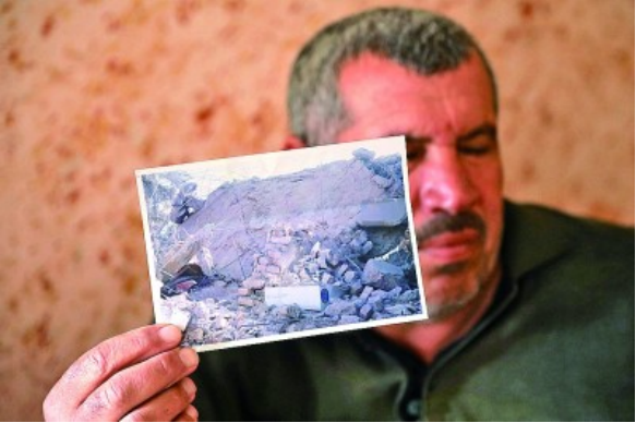 2005年12月一个寒冷的冬夜,易卜拉欣正与家人和朋友在伊拉克萨拉赫丁省的家中欢聚,不料美军发射的导弹击中了房屋,一个幸福的家庭在爆炸中被毁。在这场惨剧中,包括易卜拉欣年仅12岁的女儿和妻子在内的3名平民死亡,12人受伤。经医院抢救15天后,易卜拉欣才从昏迷中醒了过来,但他的第六、八节脊椎骨断裂,导致终身瘫痪。图为2022年1月4日,在伊拉克萨拉赫丁省,易卜拉欣展示自家房屋被炸毁的照片(新华社发)。