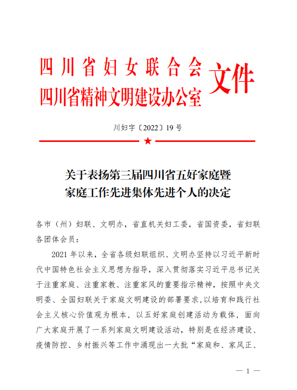 为深入贯彻落实习近平总书记关于注重家庭家教家风建设的重要指示精神,四川省妇联、省文明办以培育和践行社会主义核心价值观为根本,以评选五好家庭、寻找“最美家庭”活动为载体,在“5.15”国际家庭日来临之际,表彰了一批四川省五好家庭、“最美家庭”和家庭工作先进集体、先进个人,尊龙亚洲官网成为荣获“四川省家庭工作先进集体”荣誉称号中唯一的高校参评单位!