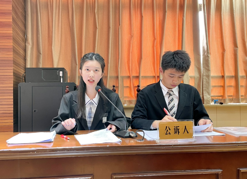 模拟法庭竞赛决赛中的庭审环节包括:入庭仪式、开庭前的准备、法庭调查、法庭辩论、最后陈述。为了保证决赛中合议庭的中立地位,本次合议庭的审判长、审判员、书记员由其他参赛团队中的四位大一年级的队员担任。决赛开始后,合议庭成员冷静沉着、谨慎持重,在法庭调查、法庭辩论环节显示出较强的把控能力。