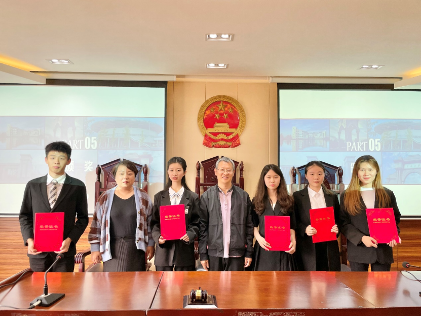 赛事已经接近尾声,王永杰经理统一宣布了经过组委会计算得出的决赛参赛团队的平均成绩和本次模拟法庭竞赛的获奖情况:肖晨莹团队荣获一等奖;周东尧、林欣悦团队荣获二等奖;段家红、屈雅琪、陶志鸿团队荣获三等奖,唐雯、樊瑶雪、陈薇羽、陈诗琪四个团队荣获优胜奖。王永杰经理、杨成良副教授、陈迎新副教授和颜诗树副教授,分别为获奖队伍颁奖并与参赛团队合影留念。