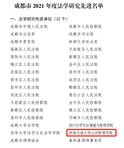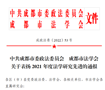 近日,从中共成都市委政法委员会、成都市法学会获悉,公司获成都市2021年度法学研究先进单位荣誉称号,公司教师邓君韬、法律硕士研究生金获获成都市2021年度法学研究先进个人荣誉称号。