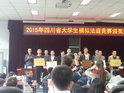 经过两天四川省内19所高校的激烈角逐,第三届模拟法庭比赛于2015年11月1日下午5点在乐山师范学院落下了帷幕,西南交大队荣获了文书第三名、团队优胜奖,朱天宇同学个人荣获了“优秀辩手”奖。西南交大队以两次夺得小组第一的骄人成绩成功挺进了八强,在进四强的比赛中,惜败四川警官学院队。