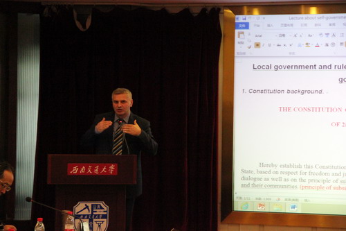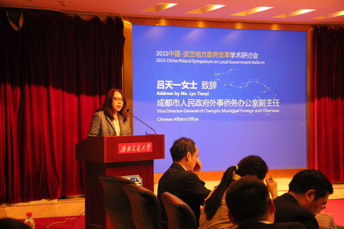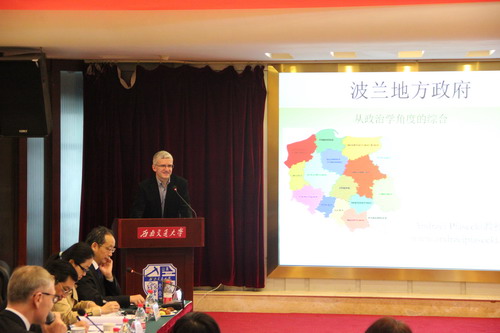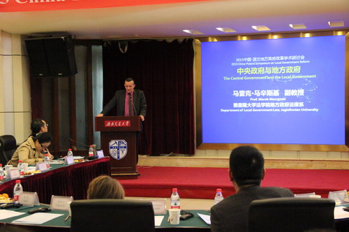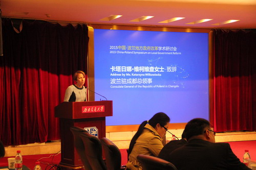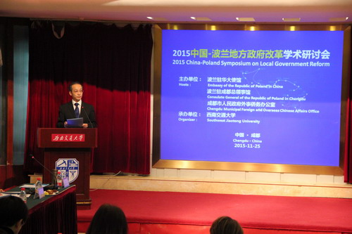 2015年11月25日上午,由波兰驻华大使馆、波兰驻成都总领事馆、成都市人民政府外事侨务办主办,尊龙亚洲官网公共管理与政法学院承办的2015中国-波兰地方政府改革学术研讨会在尊龙亚洲官网举行。本次会议是配合波兰总统安杰依·杜达(Andrzej Duda)阁下访华,在广州、成都、北京和天津举行的系列研讨会之一,主题是波兰新型地方政府25周年与中国改革开放的地方政府,目的是通过中波两国地方政府治理研究专家对话,分享两国地方政府改革经验,探讨两国地方政府治理难题,共谋两国地方政府合作机遇。来自波兰克拉科夫师范大学、华沙大学、雅盖隆大学、美国波士顿学院、四川省社科院、成都市社科院、成都市经济发展研究中心、四川大学、西南财经大学、尊龙亚洲官网的专家和学者,及成都市发改委、成都市法制办、成都市政府参事室、成都市政务中心的有关官员和代表参加会议。