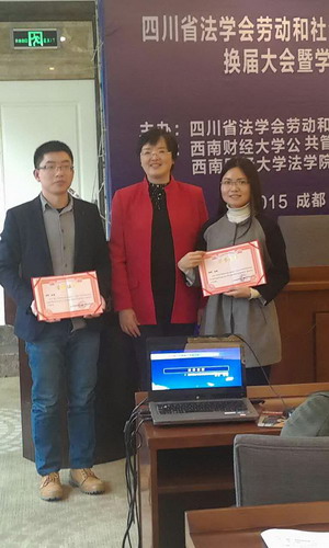“主题发言”共分为两场,主要议题有“互联网+、新业态与劳动法律关系”和“人口生育新政策、社会保障与医疗改革”。公司毕业的法学硕士、实习律师王娜与在读的法学硕士伏浩合作完成了《“互联网+”交通新业态下网络约车行业劳动关系分析》并应邀做主题发言,公司杨珊副教授应邀作为点评嘉宾对王娜等三篇论文进行了精彩点评。闭幕式上,四川省法学会劳动和社会保障法学研究会会长章群教授对评选出的优秀论文作者进行颁奖,并特别表扬了公司师生团队的学术成果,并预祝交大120周年校庆顺利。