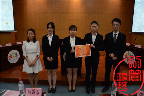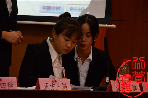 进入自由辩论环节后,双方更是针锋相对,使得比赛进入白热化阶段。公司一辩与二辩表现出色,抑扬顿挫,字字珠玑,冷静沉着地阐述我方观点。与此同时,我方选手合理分配时间,在对手时间用完的情况的下,一辩、二辩利用剩下的20多秒时间轮流补充与完善观点。值得一提的是作为我方唯一的大一队员三辩郝宇在质询环节虽略显生涩,但总能针对对手出现的失误做出及时的反应,又以实际生活中例子来打乱对手的思路,着实令人敬佩。在整场比赛过程中,四辩一直认真记录,也因此在随后的陈词中,能够对对手逻辑上的漏洞逐一回击,为赢得比赛做出最后的努力。