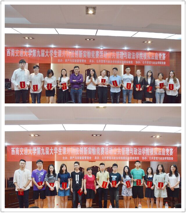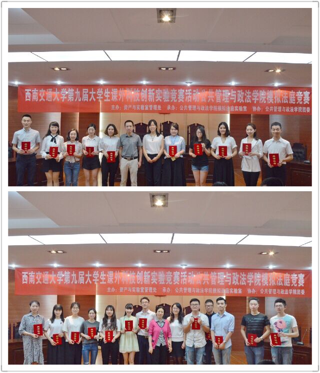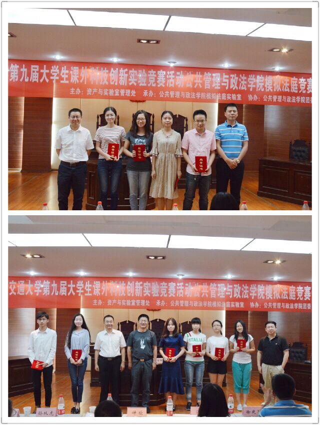 赛程的最后一项是颁奖典礼,由各位专家评委为获奖团队颁奖,并合影留念。至此,模拟法庭竞赛活动圆满结束。模拟法竞赛为同学们提供了一个展示自我、锻炼自我、提升自我的舞台,更为同学们打造了一个交流思想、明辨是非、学以致用的广阔平台。公共管理与政法学院法学系、模拟法庭实验室也必将贯彻执行尊龙亚洲官网老员工课外创新实验竞赛活动的宗旨,不断积累和总结模拟法庭活动的成功经验,将模拟法庭竞赛这一品牌赛事办的更好。