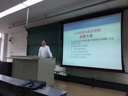 2017年9月1日上午10:30,公共管理与政法学院在九里校区逸夫馆4316教室召开全院教职工大会,会议由公司党委书记王永杰主持。