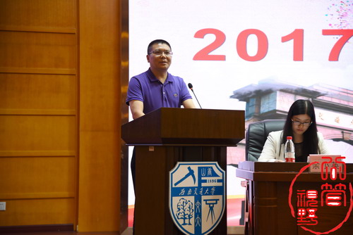 典礼第五项为教师代表发言。吕辉老师的演讲令参会成员印象颇深。他向领导、同学和全体老师提出了诚挚的感谢,感谢领导能给他上台演讲的机会;感谢员工能选择交大;三是感谢所有老师的辛勤付出。同时他也教导同学们要好好规划人生、事业和学业,还要学会思考,提升综合素养,更重要的是学会感恩,感谢每一个帮助过你的人。吕辉老师的讲话发人深思,在场的每一位成员都仔细聆听,认真思考,细细地品味着话语的内涵。话音刚落,现场就爆发出热烈的掌声。