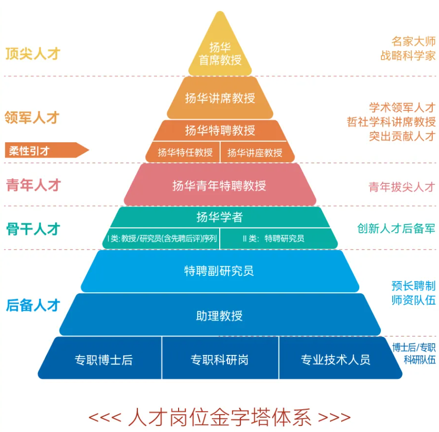 全新重塑“人才岗位金字塔体系”,以创新能力、质量、实效、贡献为导向,全新设置扬华教授、扬华学者、扬华讲座教授、扬华博士后、预—长聘制团队等5个序列16种人才团队岗位,促使各类人才“同台竞技”。系统优化“人才培育金字塔体系”,打造多类型多层级的人才培育支持体系,“一人一策”“一团一策”制定培育方案,多措并举提供全周期人才发展支持。