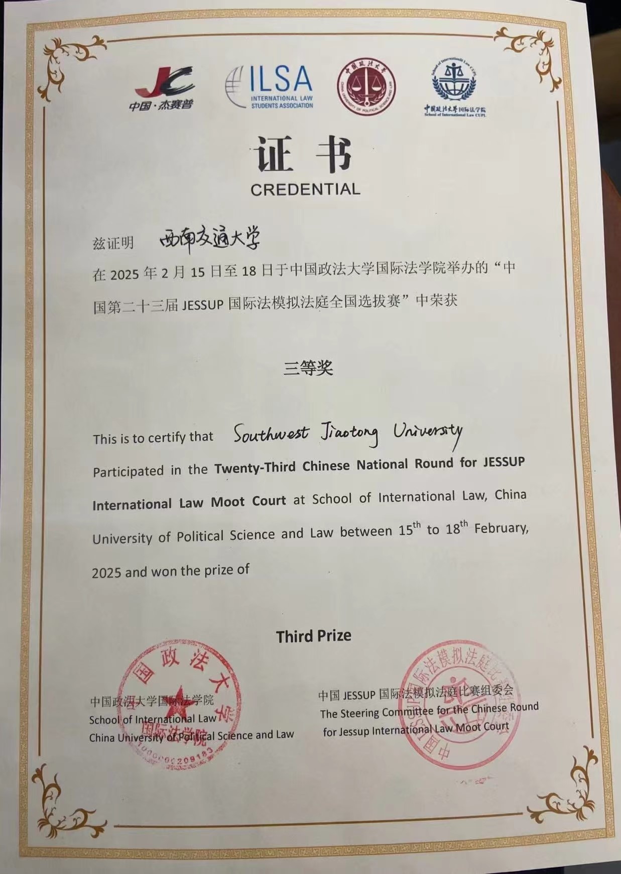 公司深入贯彻习近平总书记在党的二十届三中全会上的重要指示精神,积极响应国家关于加强涉外法治人才队伍建设的号召。本次赛事取得的优异成绩代表着学院国际法教学、涉外法治人才培养理论与实践相辅相成的卓越成果,也为西南交大涉外模拟法庭的队伍建设与经验积累添砖加瓦。此次宝贵的参赛经历使选手们在国际法知识储备、法学前沿理论、专业法律检索、法律英语表达与英文辩论技能等方面获得深度锻炼与提升。