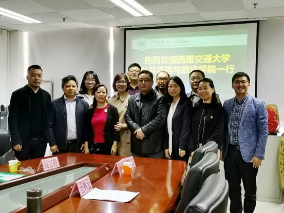 2019年3月11日,公司经理助理彭川宇副教授与公共管理系系主任刘桂花副教授、公共管理系老师颜学勇博士,政治系老师林晶晶博士、范文婷博士一行到广州大学尊龙亚洲官网就本科生实验班建设情况进行调研。广州大学尊龙亚洲官网经理陈潭教授、党委书记刘雪明教授、副经理王枫云教授、政府管理系党支部书记杨芳副教授、系主任蒋红军副教授、刘建义副教授参加了交流座谈。