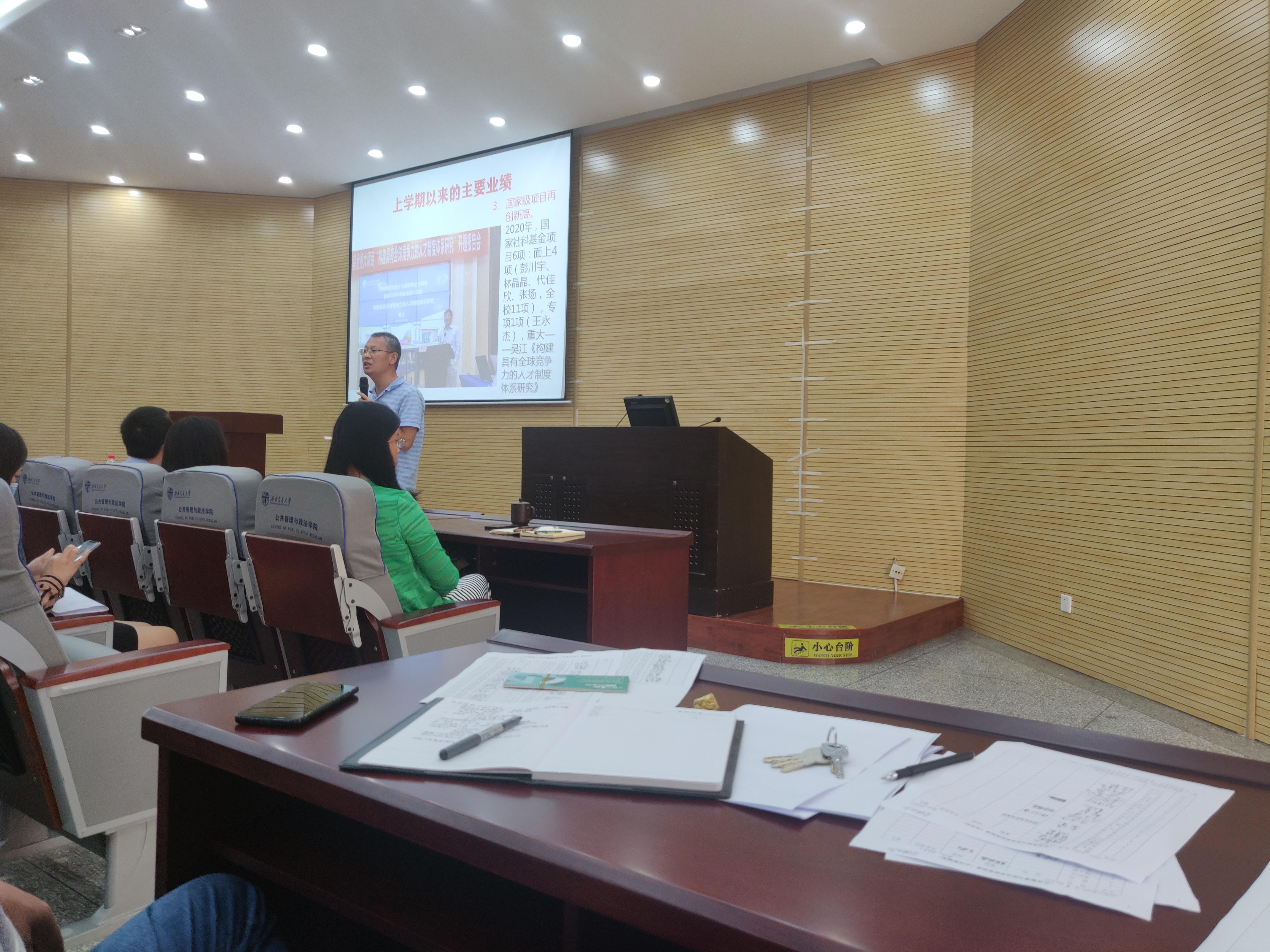 会议第四项,经理王永杰首先对学校中层领导干部会议会议精神向全院教职工进行了传达,随后就上半年的主要工作成效做了简要介绍,对下班年的工作安排作了整体部署。王经理重点强调了学院上半年在国家级项目的立项数量上再创新高,此外,学院在教育部第八届高校科研优秀成果奖、省级基地建设、教育部人文社科项目立项、立德树人先进表彰和抗击疫情方面都取得了一定成绩。王经理指出,下半年学院的重点工作是公共管理一级学科博士点申建,同时还要兼顾公共管理和法学学科十四五规划制定、第五轮学科评估、党委巡察、申请校院两级本科教学质量保障联动试点等工作。