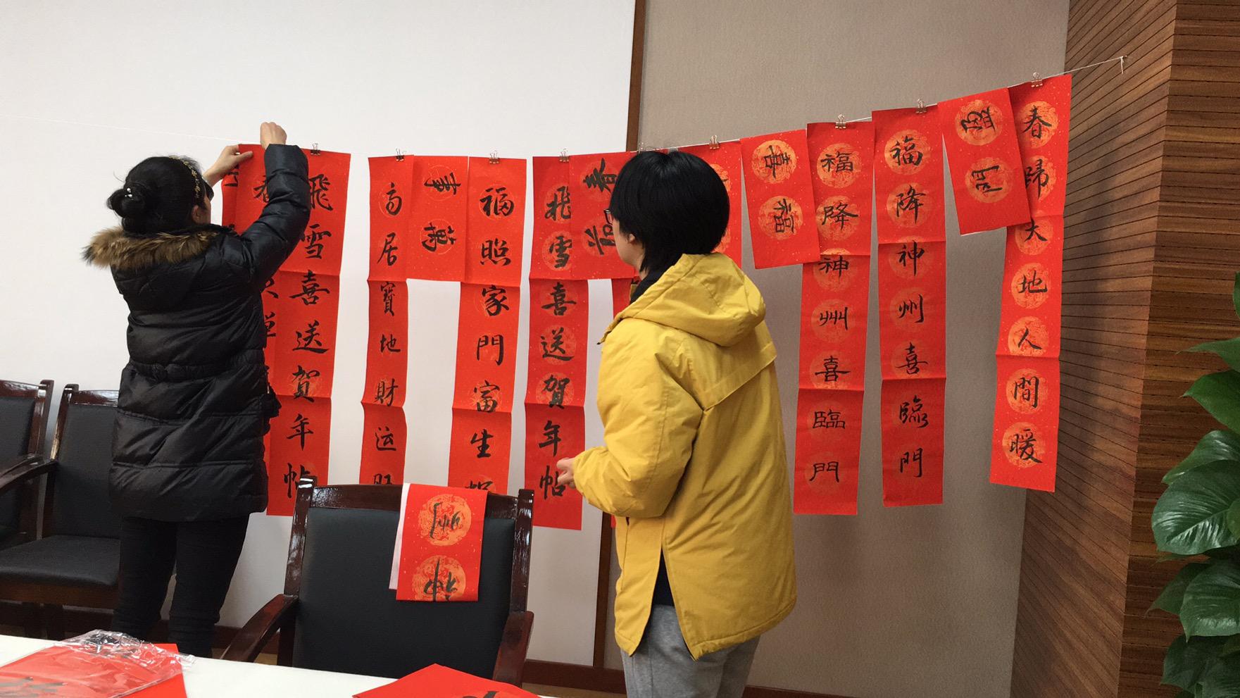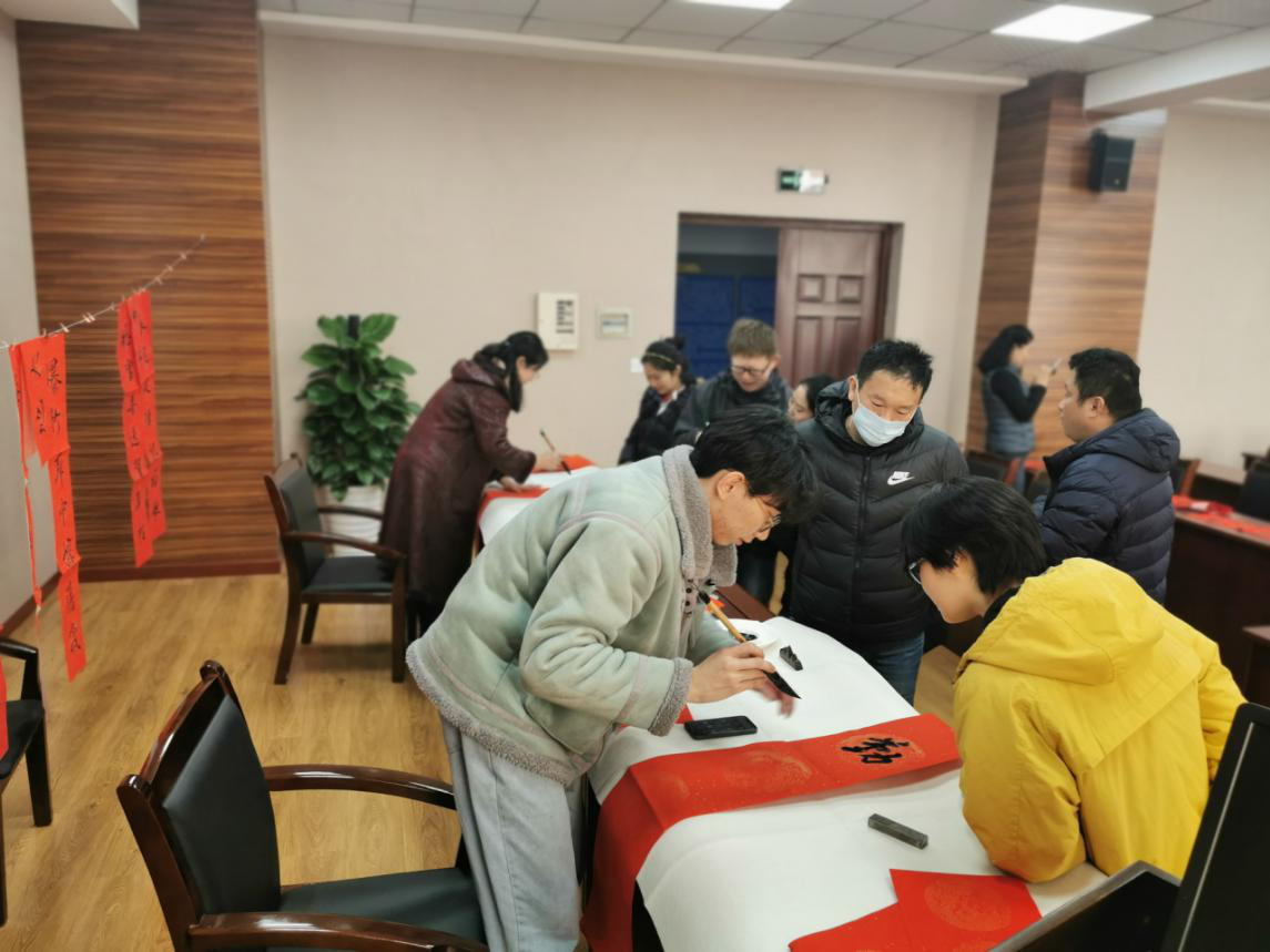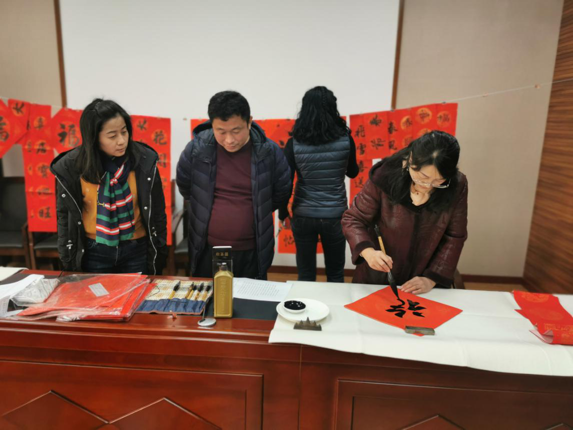 疫情防控期间,为响应国家和省市关于留在当地过节、过年的号召,公司党政工团于2021年1月21日下午邀请了书画协会的老师和同学在九里校区01216室为学院教职工写“福”字、送新春对联。