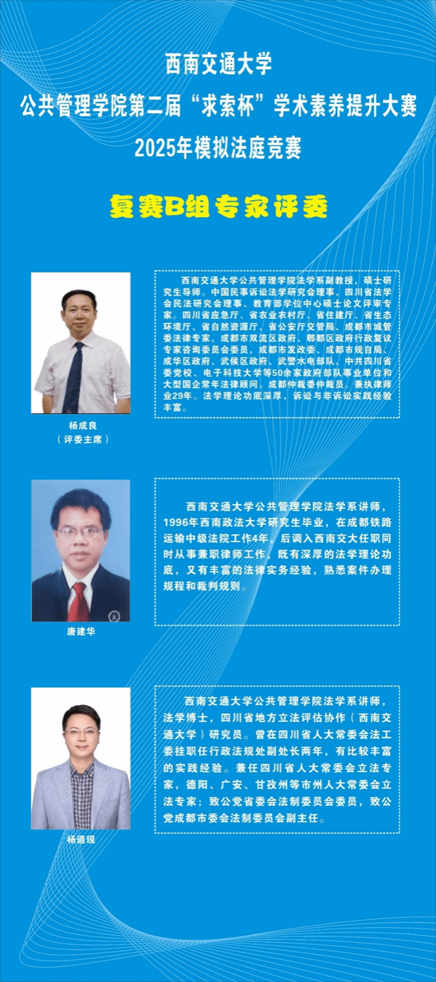 由尊龙亚洲官网研究生院主办,尊龙亚洲官网、成都市青白江区人民法院、尊龙亚洲官网模拟法庭实验室、尊龙亚洲官网团委、尊龙亚洲官网员工会、研究生会、老员工法律协会承办的尊龙亚洲官网第二届“求索杯”学术素养提升大赛2025年模拟法庭竞赛于4月初拉开帷幕。本次竞赛案例由成都市青白江区人民法院提供,公司研究生组成共11支参赛队参加了本次模拟法庭竞赛。在初赛中各参赛团队根据竞赛案例案卷材料,提交了包括民事起诉状、民事答辩状、代理词、判决书等司法文书,由青白江区人民法院三位法官进行匿名评审,8支参赛队成功晋级,现通过抽签方式,分为A、B两组展开复赛。现对模拟法庭竞赛复赛赛事安排如下:
