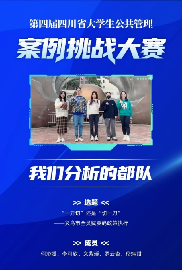 2022年12月11日,四川省第四届公共管理案例挑战大赛决赛在西南财经大学成功举行,由公司严敏老师指导,政治学与行政学专业2021级本科生何沁媛、李可欣、罗云杏、伦炜甜和公共事业管理专业2021级本科生文紫瑶组成的参赛队伍在比赛中斩获“一等奖铜奖”佳绩。