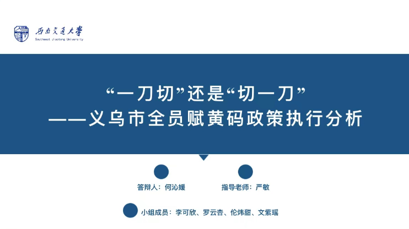 本次大赛分为初赛、复赛和决赛三个阶段,历时半年。公司学子在指导老师悉心指导下,完成了从开题报告、调研设计、实地访谈、报告撰写、现场答辩的全过程,历尽数次修改、调整和完善,最终凭借高质量文本《“一刀切”还是“切一刀”——义乌市全员赋黄码政策执行分析》从众多参赛队伍中脱颖而出,与各高校参赛队伍同场竞技、切磋交流,获得评委专家的一致肯定。