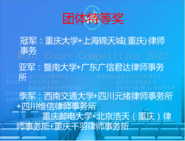 2022年12月18日,2022年第二届“领军杯”涉外模拟法庭全英辩论赛在重庆大学落下帷幕,经过激烈角逐,公司参赛团队勇夺本次高水平比赛的季军,荣获团体特等奖。