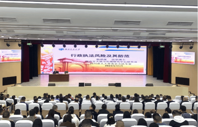 2023年11月27日,泸县人民政府邀请四川省立法专家、公司教师杨道现博士作《行政执法风险及其防范》专题培训讲座,组织行政执法人员、法制审核人员、公职律师共计263人参加培训。公司法律硕士研究邓悟随同参会学习并就基层立法联系点建设问题开展调研。