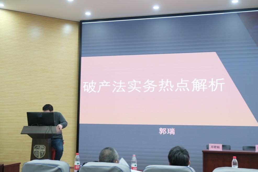 讲座开始后,郭老师首先在分析破产逃债行为所涉案件统计数量的基础上,重点探讨了破产逃债的破产法、刑法成因等热点问题。而后,郭老师还具体讲解了担保财产处置问题与未支付的执行款是否属于破产财产等问题。郭老师提到,破产法学的内容横跨实体法与程序法,涉及民商法、经济法、刑法等多个实体部门法,其调整对象、立法目的的多元化的特殊性决定了公权力在破产法中不同于其他民商事法律的地位。