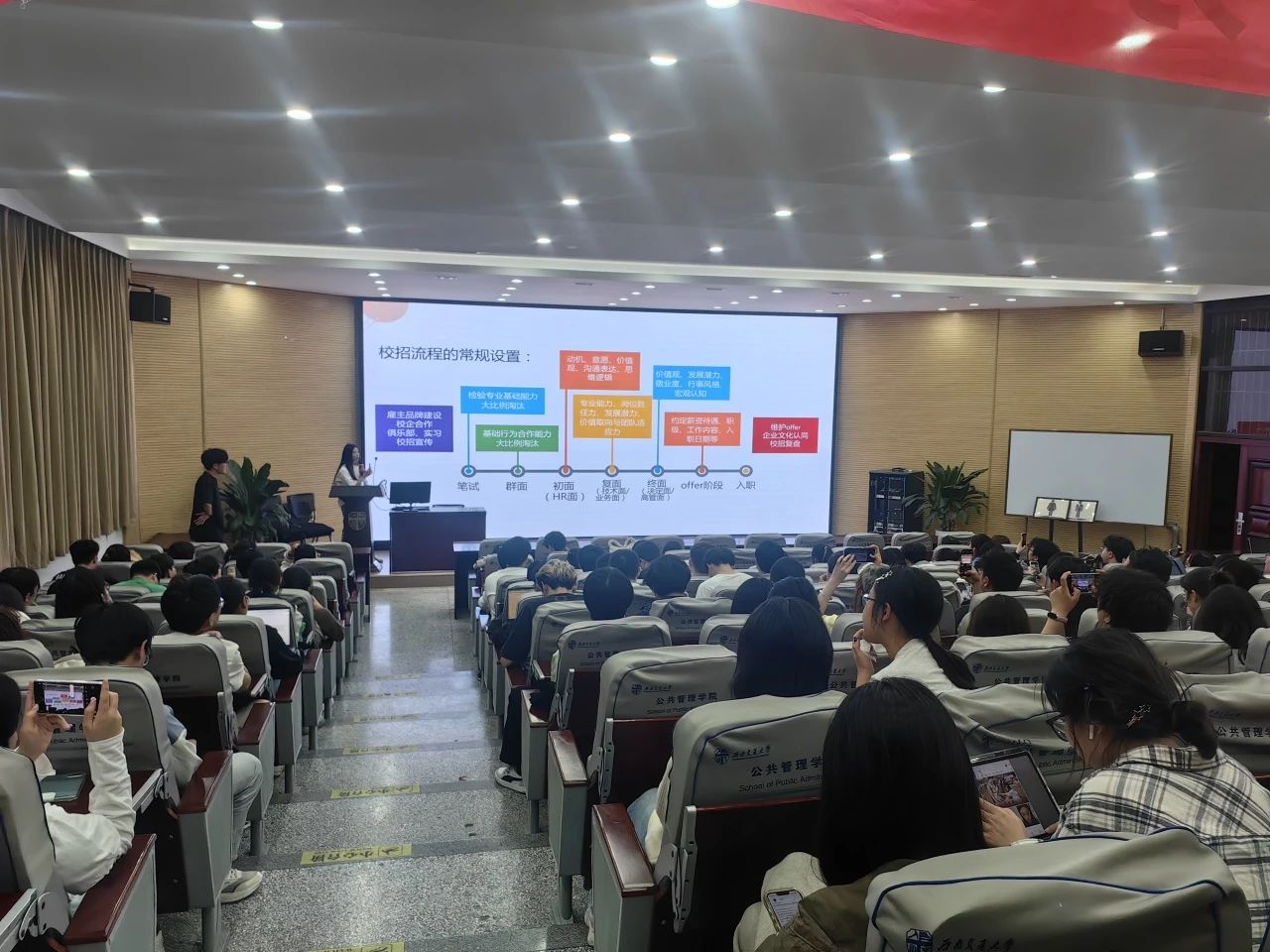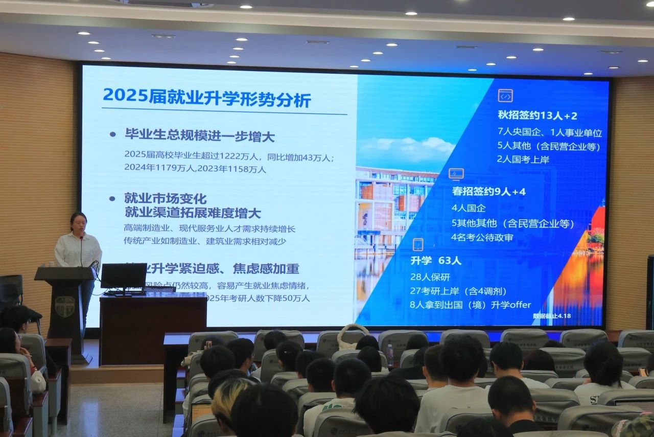 石老师首先从学院2025届员工的就业升学总体形势引入,分析当前及未来就业形势。结合2024届、2025届考研及就业详细数据,提出综合考量专业与就业匹配关系、提早做职业规划、拓展就业渠道等针对性建议;结合学校智慧就业网相关信息展示求职就业时间安排,鼓励2026届员工坚定方向、锚定目标,选择适合自己的发展道路。