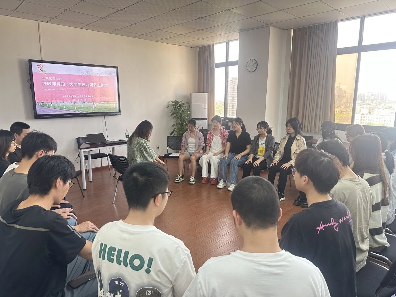 “压力调节并不复杂,它可以从一次深呼吸开始。”一开始,冯老师向同学们介绍了腹式呼吸。在冯老师轻柔的引导下,同学们闭眼感受气息流动,逐渐放松身心。随后,冯老师特别设计了“传气”互动练习,巧妙打破同学们初见的拘谨,让现场氛围迅速活跃起来。
