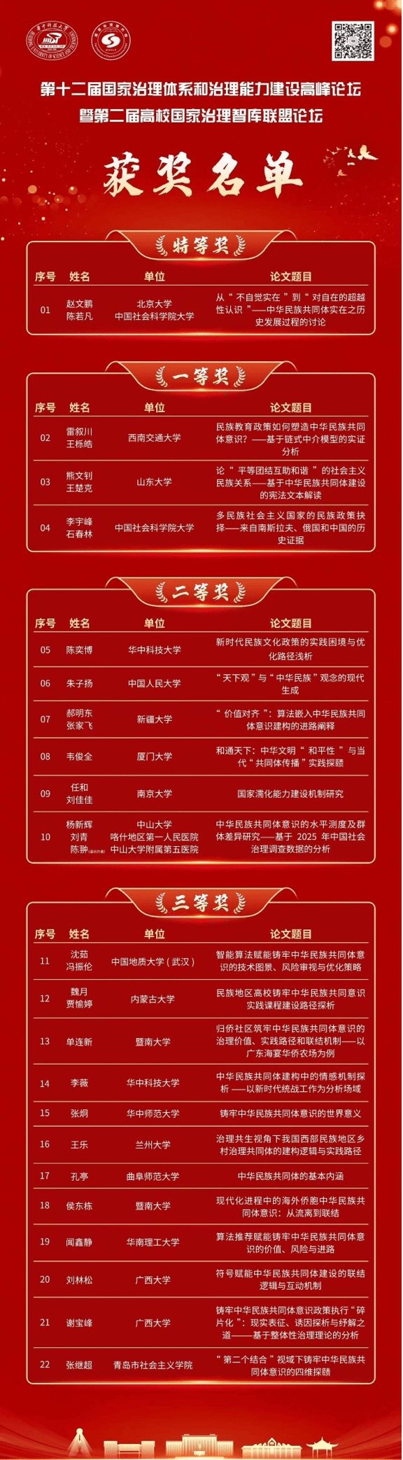 由华中科技大学和高校国家治理智库联盟主办,华中科技大学国家治理研究院、国家治理湖北省协同创新中心承办的“第十二届国家治理体系和治理能力建设高峰论坛暨第二届高校国家治理智库联盟论坛”于4月3日发起征文,截止4月30日,共收到各高校、研究机构的学者学术论文150余篇,经专家组三轮评审,筛选出22篇优秀论文,其中特等奖1篇、一等奖3篇、二等奖6篇、三等奖12篇。