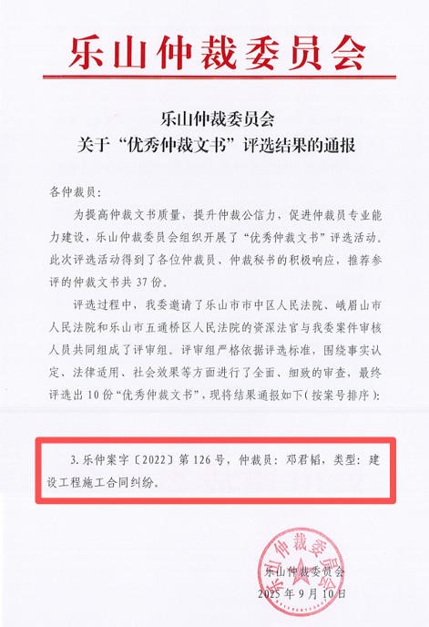 近日,从乐山市司法局获悉,公司法学教师邓君韬副教授担任独任仲裁员的一件涉教育系统建设工程施工合同纠纷裁决书获评乐山仲裁委员会“优秀仲裁文书”。