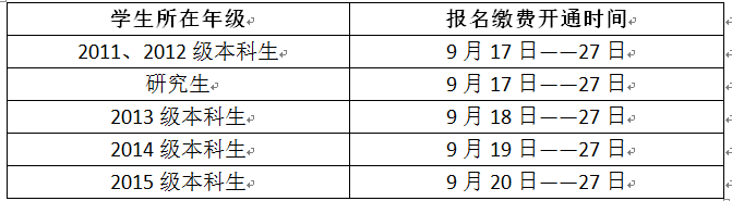 2015年9月17日-9月27日(根据不同年级,安排如下,另因考场容量有限,学校将根据缴费时间先后顺序依次满足,报满即止)。