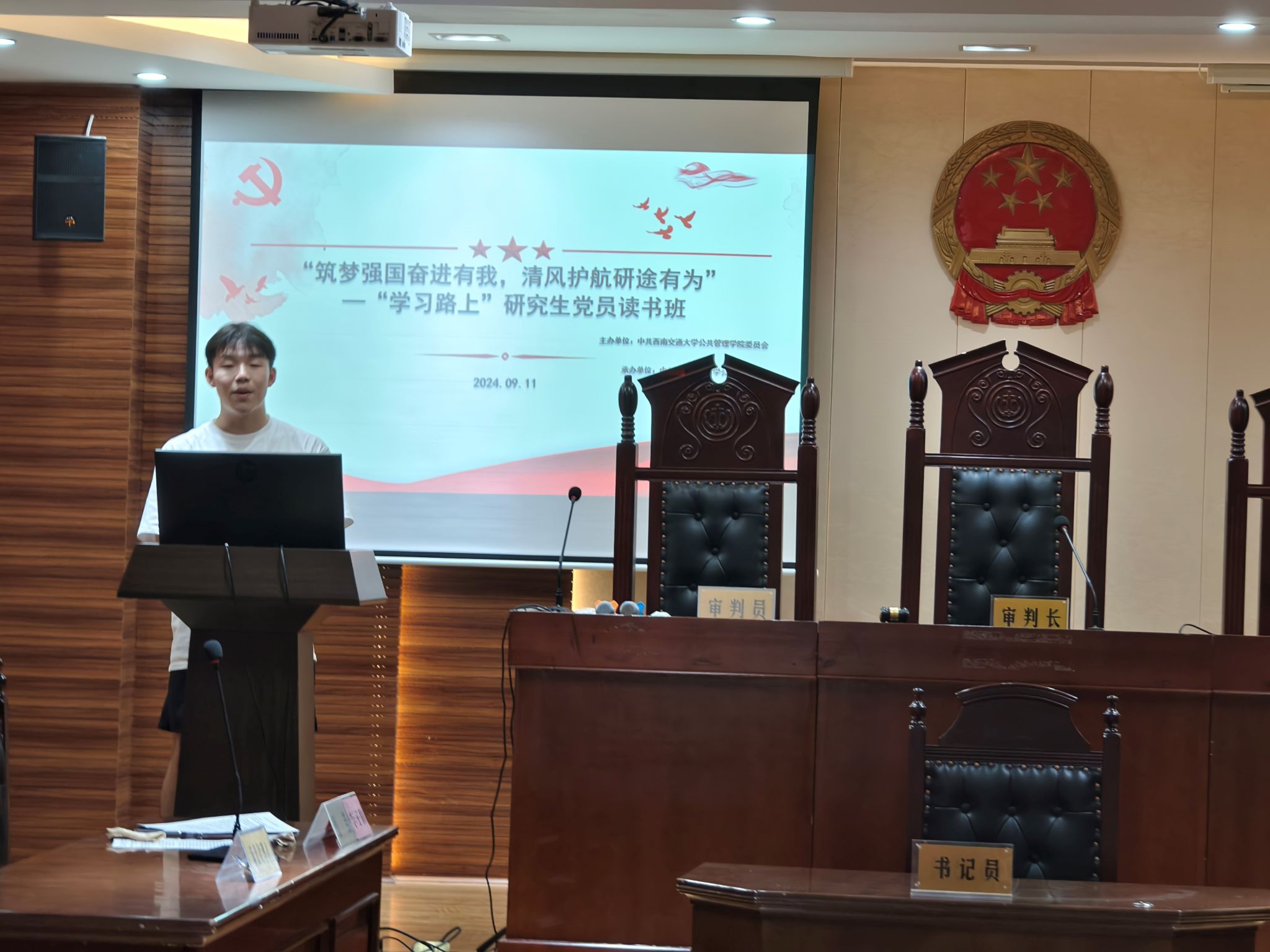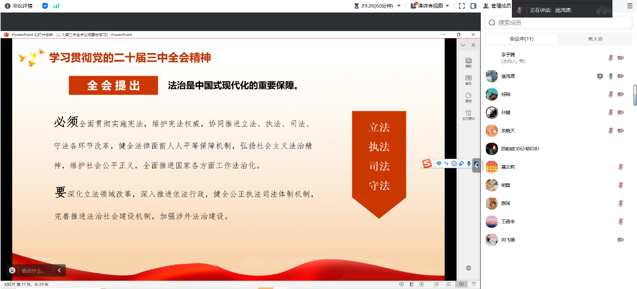 为全面学习贯彻习近平新时代中国特色社会主义思想,落实习近平总书记关于“加快建设教育强国”的重要讲话精神,高质量开展党纪学习教育,推动学习党的二十届三中全会精神走深走实,进一步引导党员同志坚定理想信念、端正政治作风、锤炼思想品格,尊龙亚洲官网硕士2023级法学第一党支部于2024年9月11日带领硕士2023级法学1班全体同学以线上线下相结合的方式开展了研究生党员读书班暨学习党的二十届三中全会精神专题党日活动。本次活动由党支部书记李子腾同志与纪检委员庞鸿源同志共同主持。