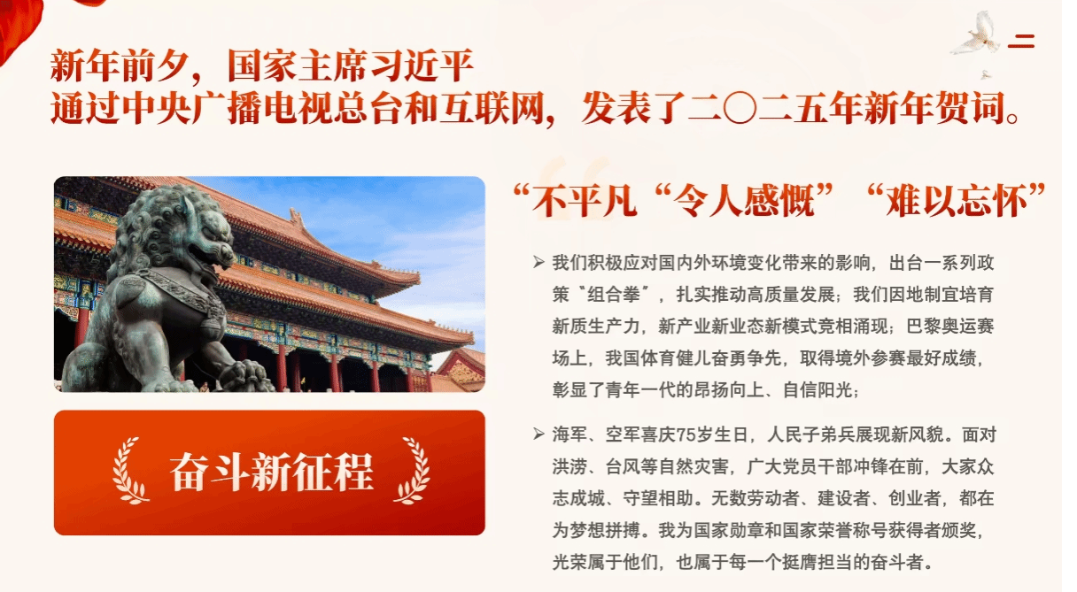 硕士公管第二党支部组织学习了习近平总书记发表的2025年新年贺词。它们承载着习近平主席对国家发展的深刻洞察和对人民生活的深切关怀。“梦虽遥,追则能达;愿虽艰,持则可圆。”回顾国家去年取得的各项成就,全体支部党员倍受鼓舞,均表示会牢记习近平总书记的殷殷嘱托,在新的一年,积极面对生活和学习中的各种挑战,为中国式现代化继续添砖加瓦。