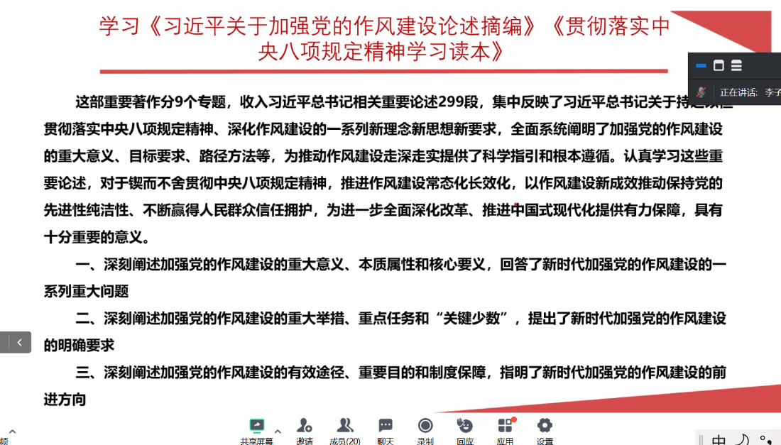 硕士公管安工第一党支部由陈美伶同志带领学习深入贯彻中央八项规定精神学习教育,强调学习教育的重要意义有为实现“十四五”目标提供保障、体现作风建设永远在路上、以作风建设推动高质量发展等。其次,带领学习新时代加强党的作风建设的重要论述,强调作风建设的重大意义、作风建设的明确要求以及作风建设的有效途径等。接着带领学习教育部直属高校学习教育综述,阐述高校学习教育的开展情况有提高政治站位,统一思想认识;坚持以上率下,全面有序启动;发扬特色优势,务求实干实效等。