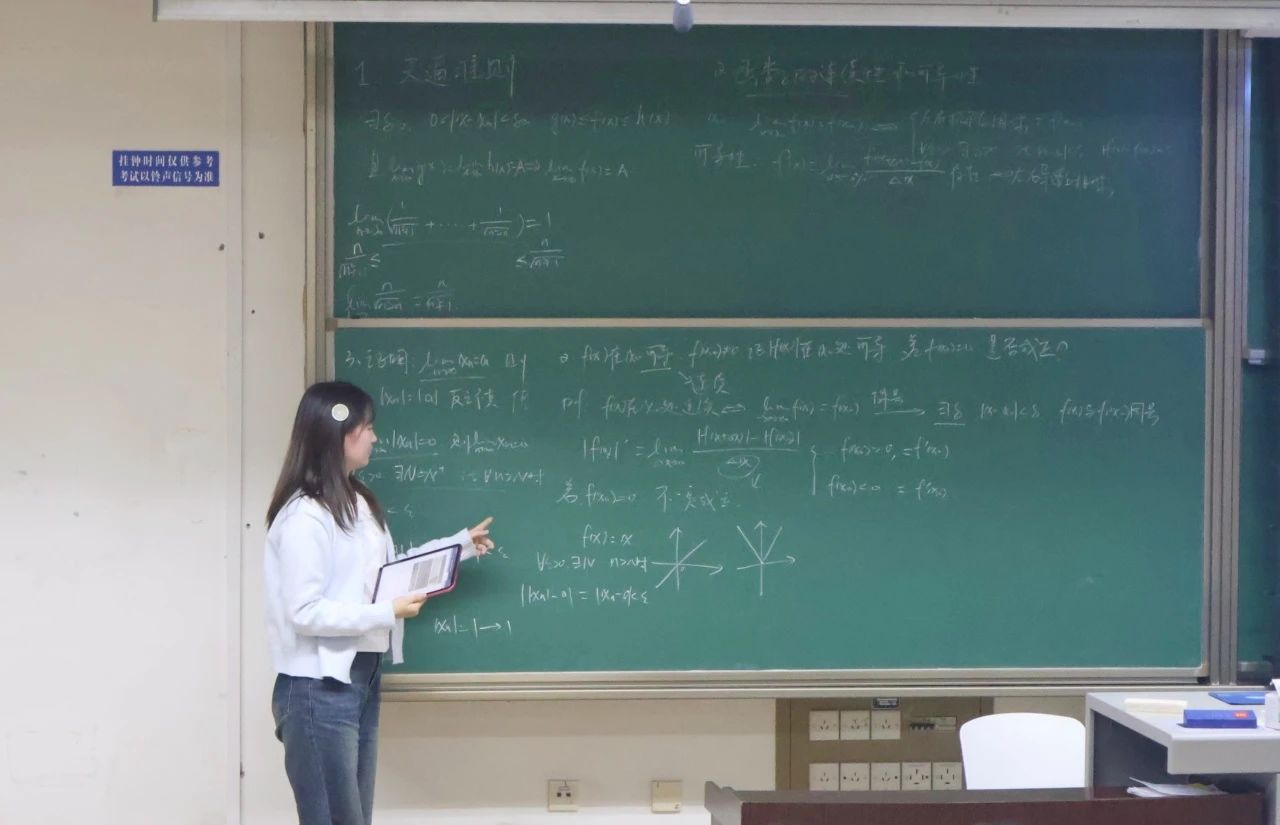 紧接着,蒋瑞雪同学以定义为引,例题为主,为同学们一一解答疑惑。精心的准备,细致的讲解,工整的板书让函数的连续性、可导性等复杂知识点变得清晰,繁琐的证明步骤也逐渐明晰易懂。