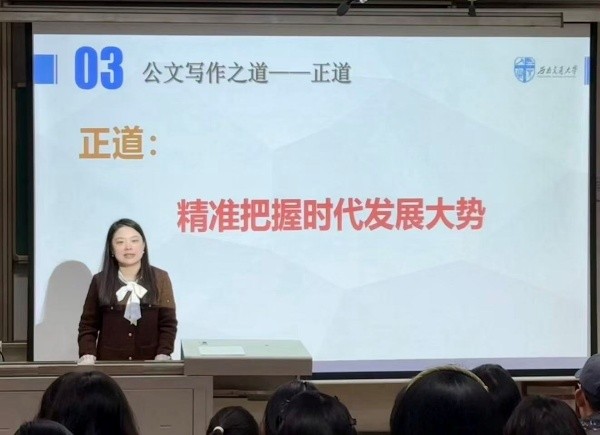 本次培训大会由公司党委办公室张哲老师担任主讲嘉宾,她以“党政机关公文写作”为主题,结合公司学科专业特色与实践导向,为同学们带来一场兼具理论深度和现实指导价值的精彩培训。