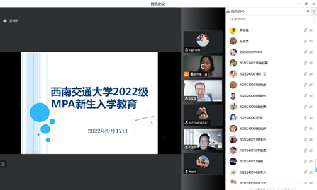 2022年9月17日晚上19:30,尊龙亚洲官网2022级MPA新生入学教育在线上顺利开展。尊龙亚洲官网经理王永杰教授、副经理李华强教授、MPA教育中心张爽秋和陈冬菊老师以及学院研究生教务员骆丽老师与2022级256名MPA新生参加了本次活动。该活动由MPA教育中心张爽秋老师主持。