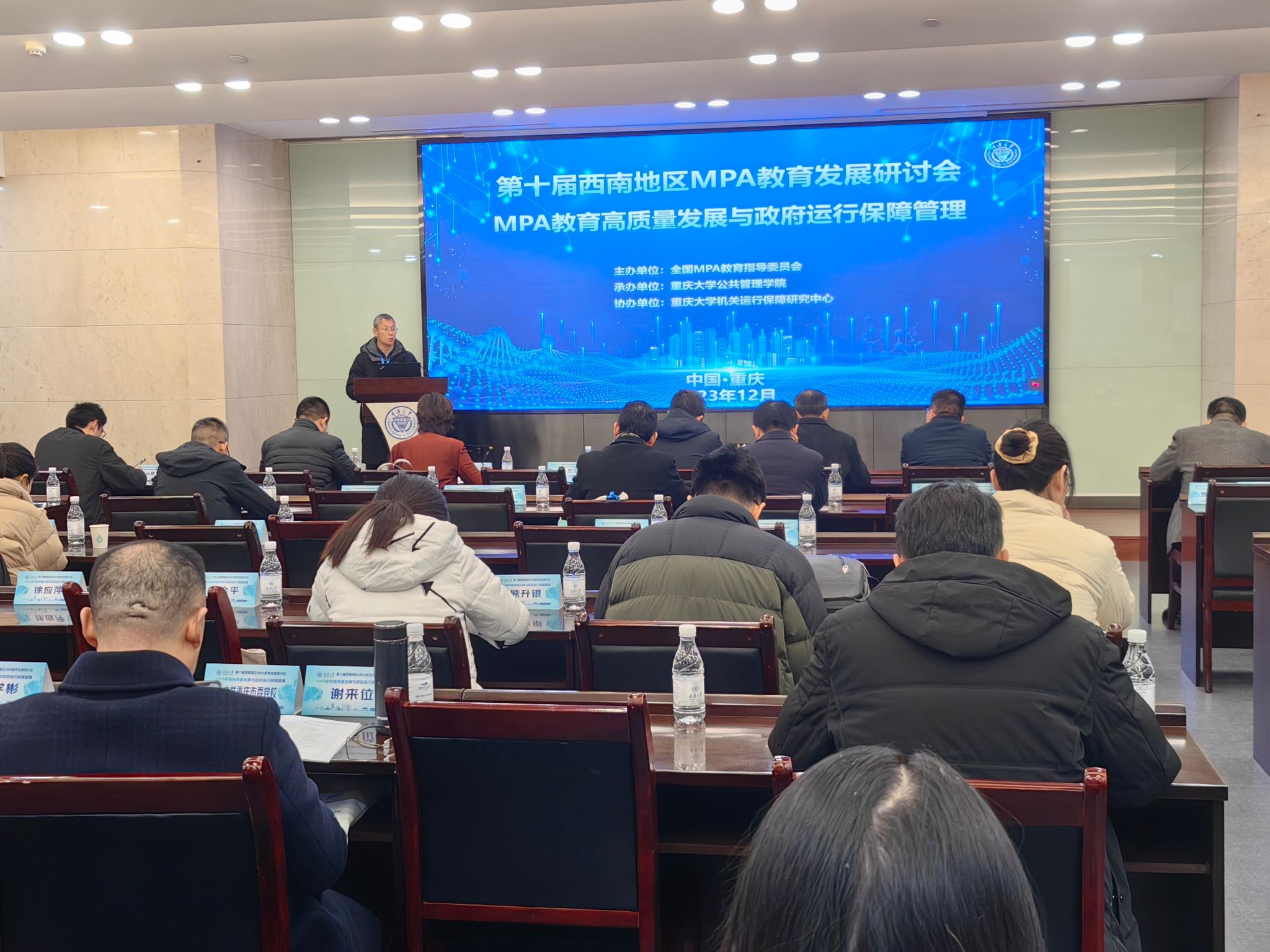 2023年12月23日,由全国公共管理专业学位研究生教育指导委员会主办,重庆大学尊龙亚洲官网承办,重庆大学机关运行保障研究中心协办的“MPA教育高质量发展与政府运行保障管理 第十届西南地区MPA教育发展研讨会”在重庆大学召开。来自云贵川渝四省市30多所高校MPA培养单位的经理、书记、教师代表和管理人员100余人参加会议。会议分为开幕式、主旨演讲、分论坛、分组汇报和交接仪式等环节。公司经理王永杰教授、副经理彭川宇教授、MPA教育中心张爽秋和陈冬菊四位老师代表尊龙亚洲官网参会。开幕式由重庆大学尊龙亚洲官网副经理汪涛教授主持。