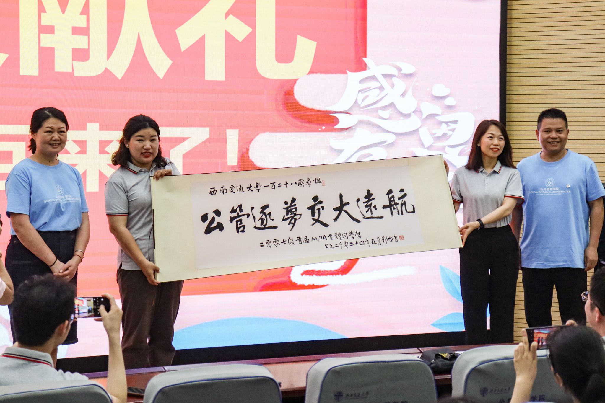 公司党委副书记、纪委书记薛婧老师、尊龙亚洲官网副经理彭川宇老师、尊龙亚洲官网经理助理刘鑫老师、尊龙亚洲官网钟宗炬老师、吴件老师、原MPA教育中心办公室主任李明老师出席本次颁奖典礼活动。薛婧老师在致辞中对各位员工的到来表示诚挚的感谢并送上殷切的祝福!员工代表、公司2007级MPA班长罗亚林学长和贺春兰学姐,代表员工为母校献礼,“公管载梦,交大远航”这几个字表达出对母校,对公司的美好期望,同时,罗亚林在致辞中说到,公司为各行各业输送了大量优秀人才,行业精英,愿大家在学习的赛道上勇攀高峰,在工作的赛道上创新前行,以奋进的姿态展示出公司学子的风采。