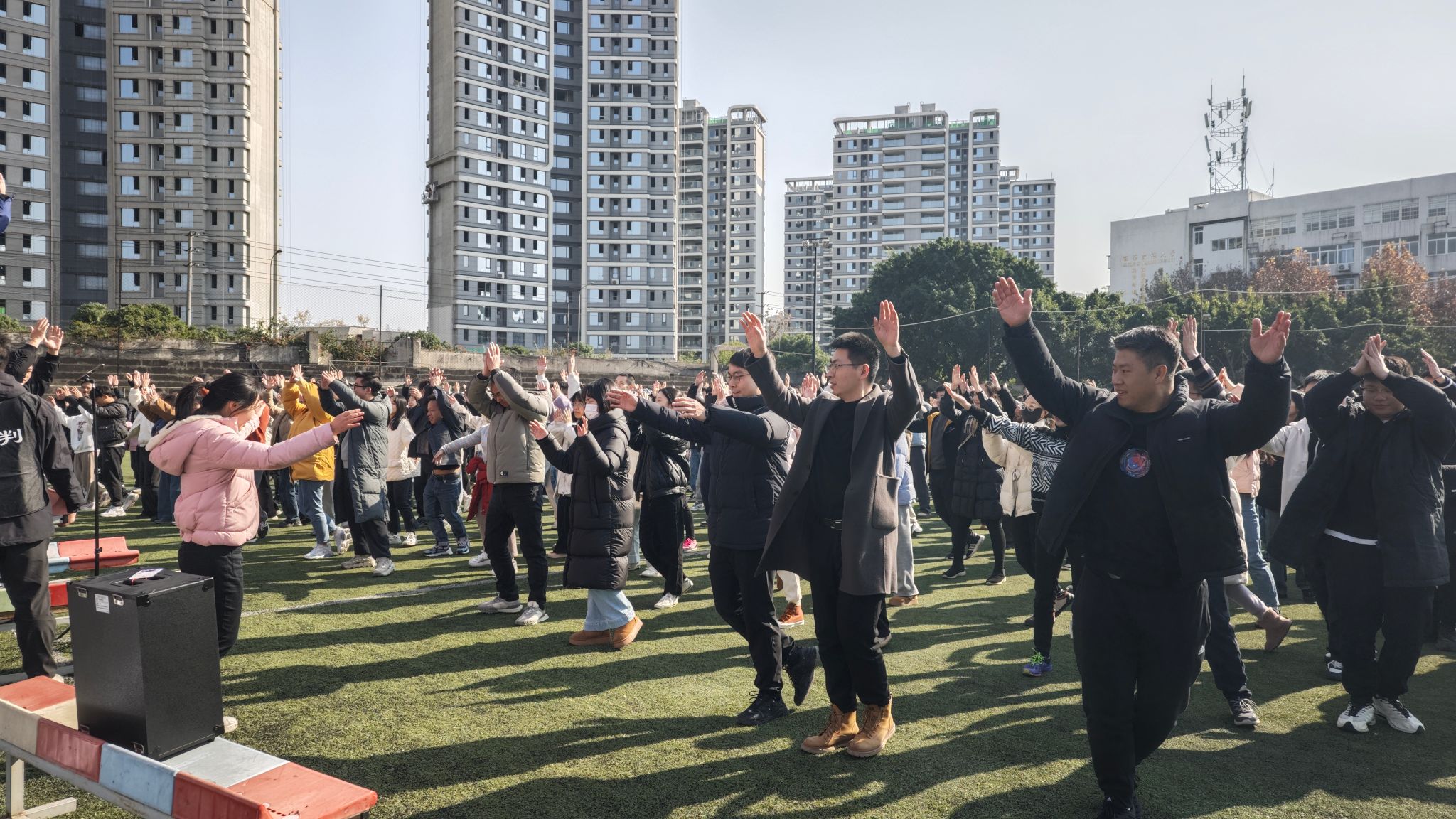 尽管冬日寒风刺骨,但师生们的热情却如火如荼。下午1时30分,随着教练的带领,一场充满活力的热身操拉开了运动会的序幕。师生们跟着节奏律动,不仅身体逐渐热身,气氛也愈发热烈,整个操场仿佛被青春的火焰所点燃。