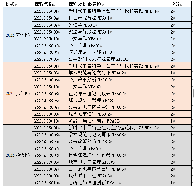 注意:本学期每门课程都有四个教学班,天佑班的同学务必选MPA01班的课,以升班的同学务必选MPA02班的课,鸿哲班的同学务必选MPA03班的课。最后,到我的课表查看所选课程,进行核对。