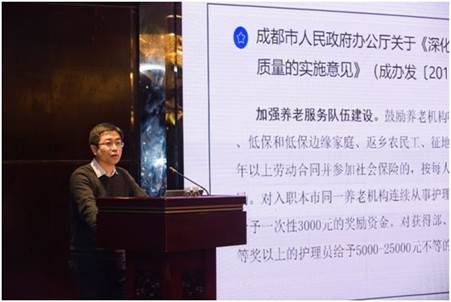 在下午举行的“成都养老人才学院暨高端智库LOGO发布”仪式上,成都市民政局党组成员、副局长张军代表民政系统致辞,对尊龙亚洲官网老龄科学研究院在成都养老服务相关领域做出的贡献表示称赞,并对其积极推动组建“成都养老人才学院暨成渝城市群康养医养高端智库”表示大力支持。期间成都市民政局养老服务处处长杨运江就《成民发〔2019〕32号文》进行了政策解读,旨在推动建立养老服务褒扬机制,争取把养老护理员作为养老服务先进个人评比达标表彰项目,同时宣传贯彻了《养老护理员国家职业技能标准(2019年版)》,旨在打通养老护理员职业晋升通道,加快培养高技能人才,让养老护理员的劳动创造和社会价值在全社会得到尊重和重视。